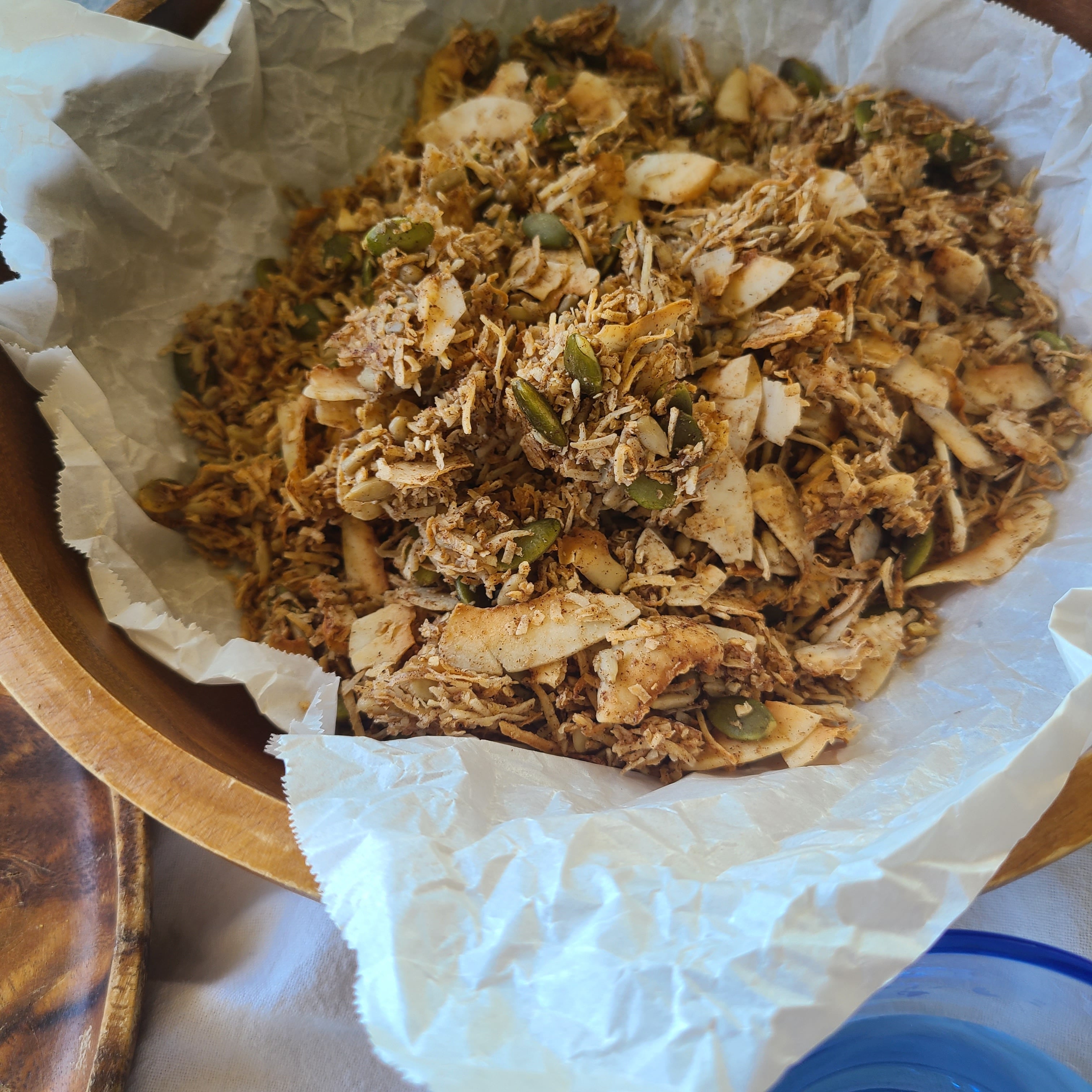 【原材料名】有機ココナッツロング(スリランカ産、国内加工)・有機ココナッツチップス・かぼちゃの種・ひまわりの種・甘味料(エリスリトール、羅漢果エキス末、甘草エキス末)・有機シナモン・国産塩